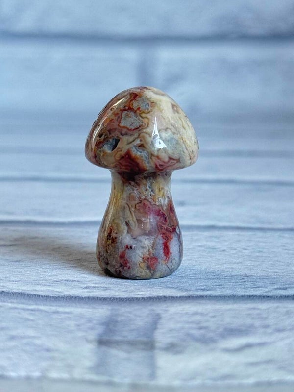 Gorgeous Crystal Mushrooms in Lepidolite, Moss Agate, Blue Tigers Eye, Unakite, Plum Blossom Jasper, Crazy Lace Agate, African Bloodstone, Petrified Wood, Yooperlite and Mahogony Obsidian materials ✨