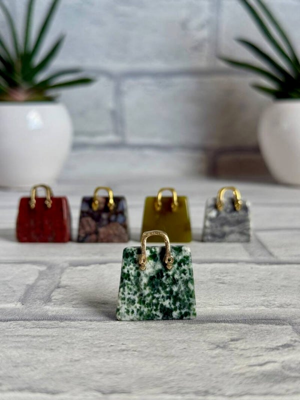 Cute Handbag Carvings in Mahogany Obsidian, Que Sera, Green Jade, Picasso Jasper and Green Tree Jasper materials ✨