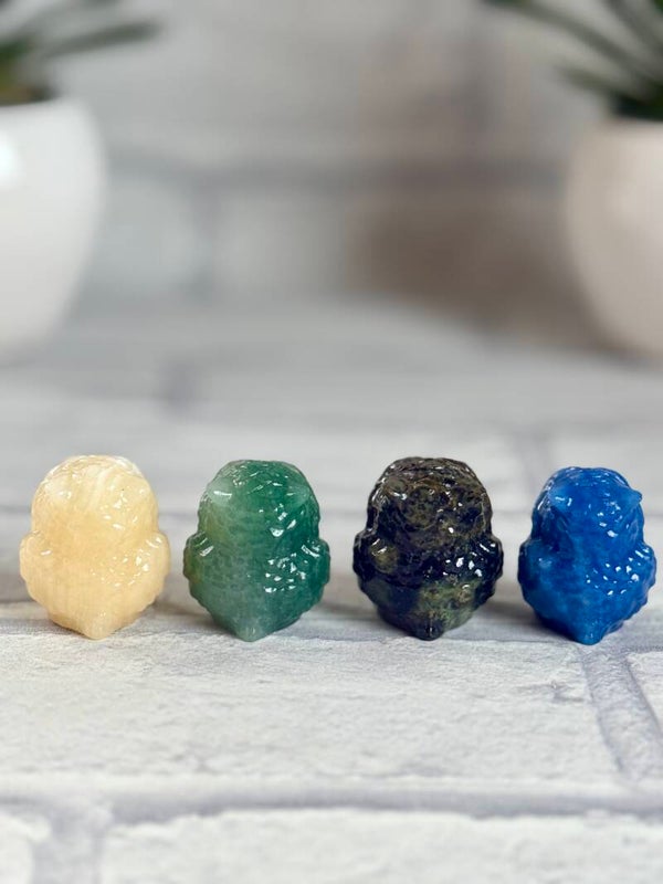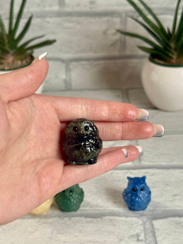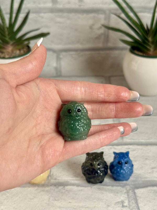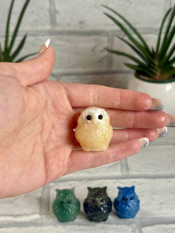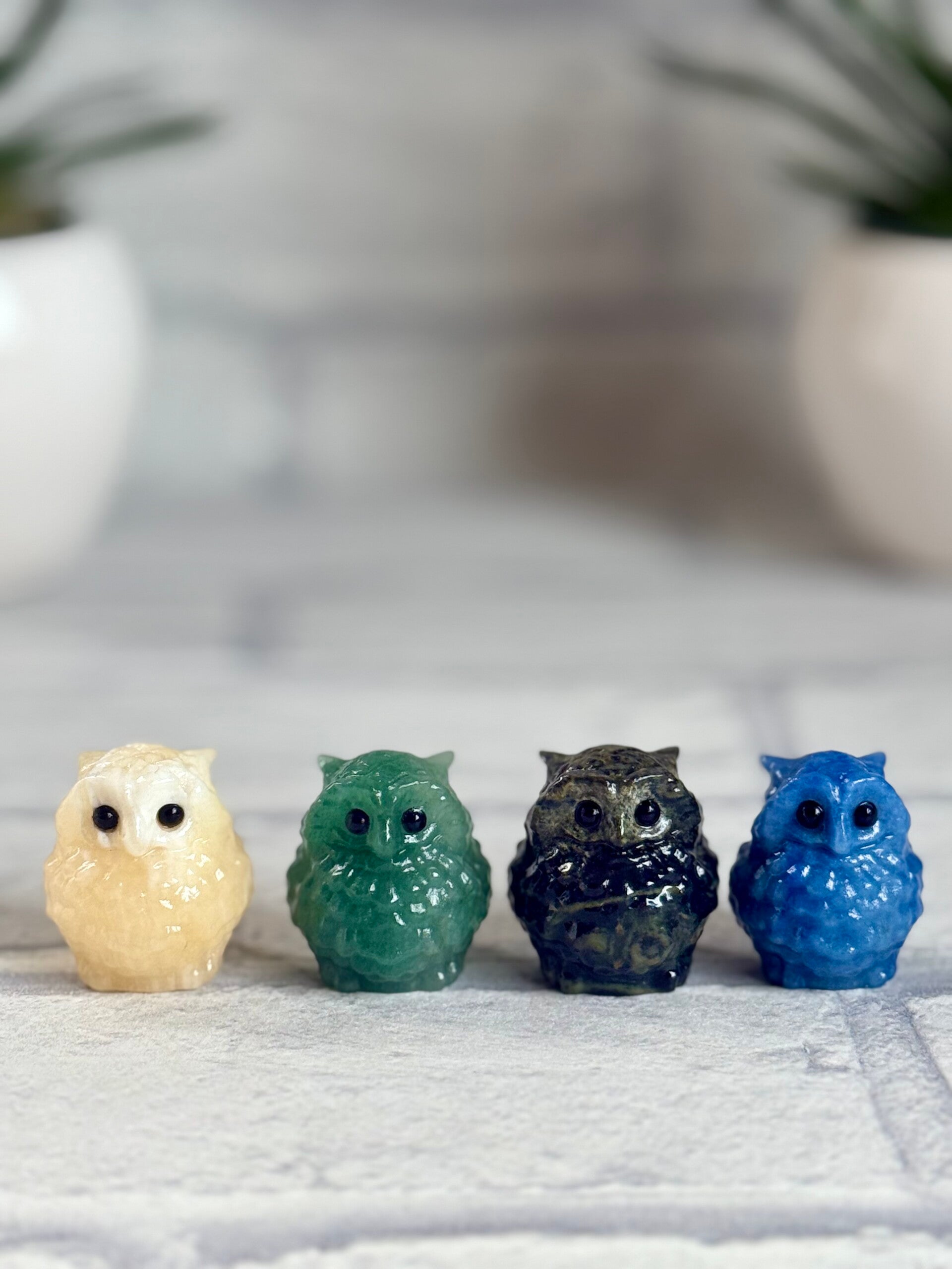 Cute Owl Carvings in Yellow Calcite, Green Aventurine, Kambaba and Blue Aventurine materials ✨