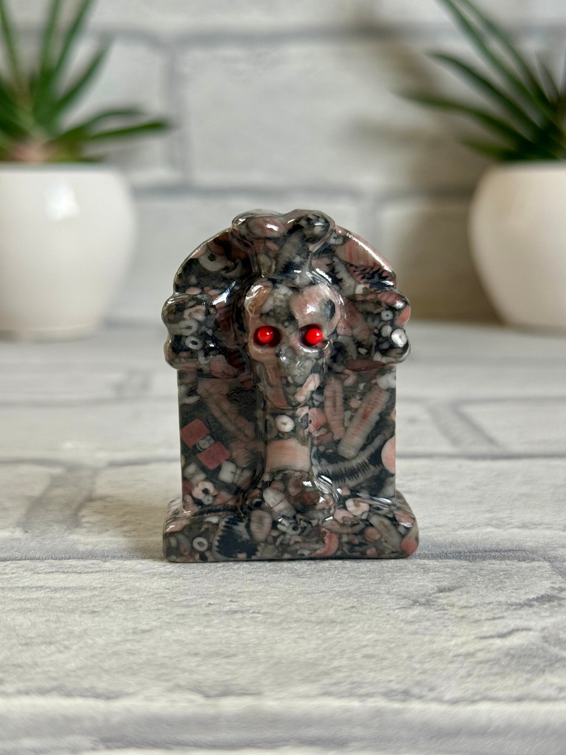 Spooky Skull And Crossbones Gravestone Carvings in Fossil Jasper, Banded Calcite, Pink Fossil Jasper and Green Aventurine materials, all with red bead eyes ✨
