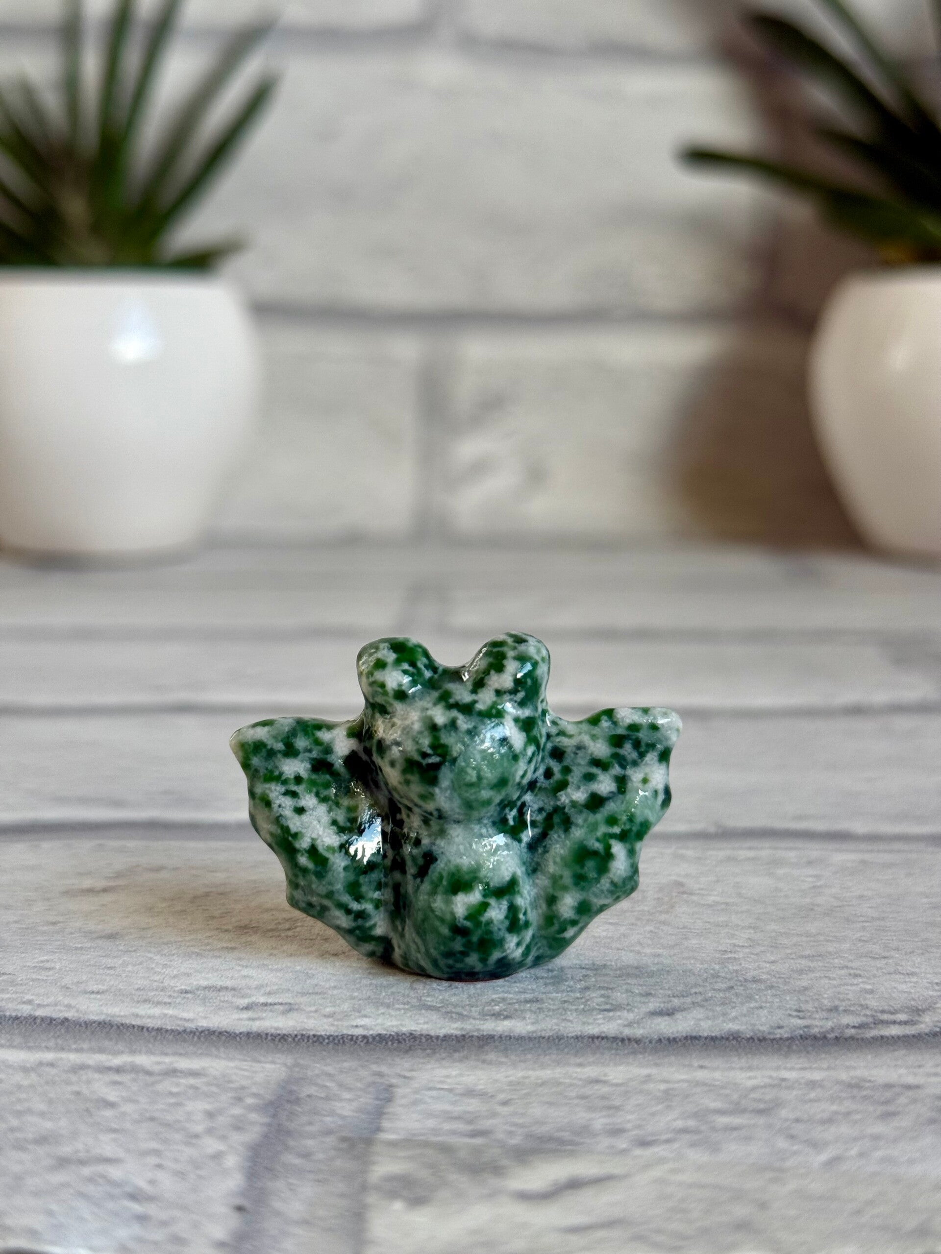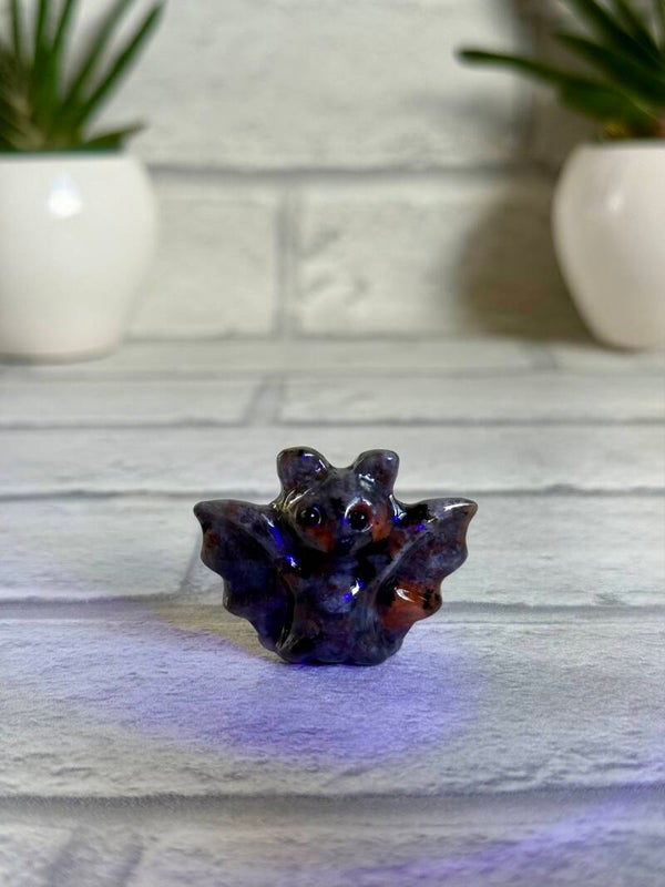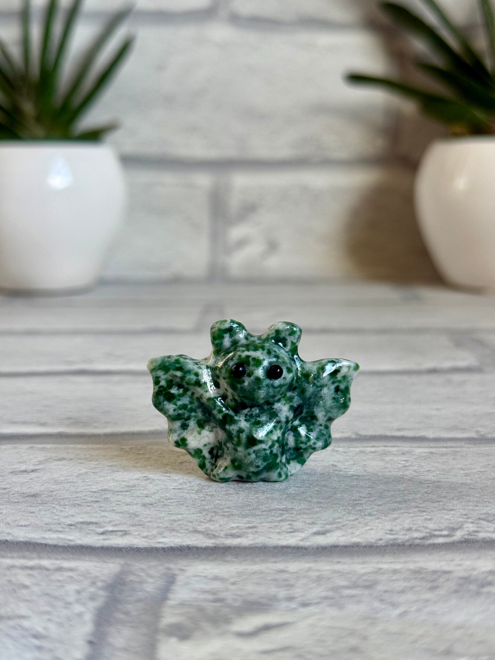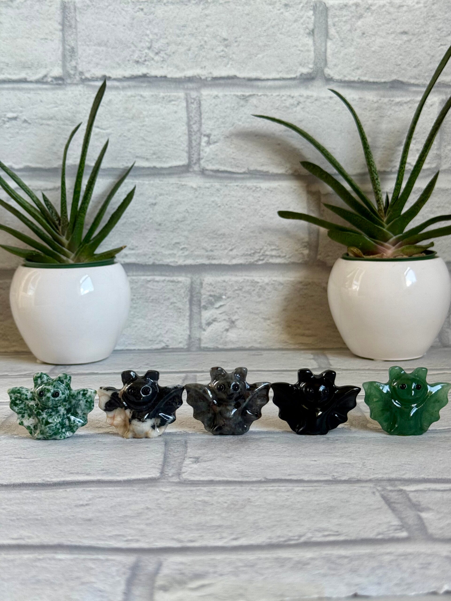 Cute Bat Carvings in Green Tree Jasper, Pink Zebra Jasper, Yooperlite, Black Obsidian, and Green Strawberry Quartz materials ✨