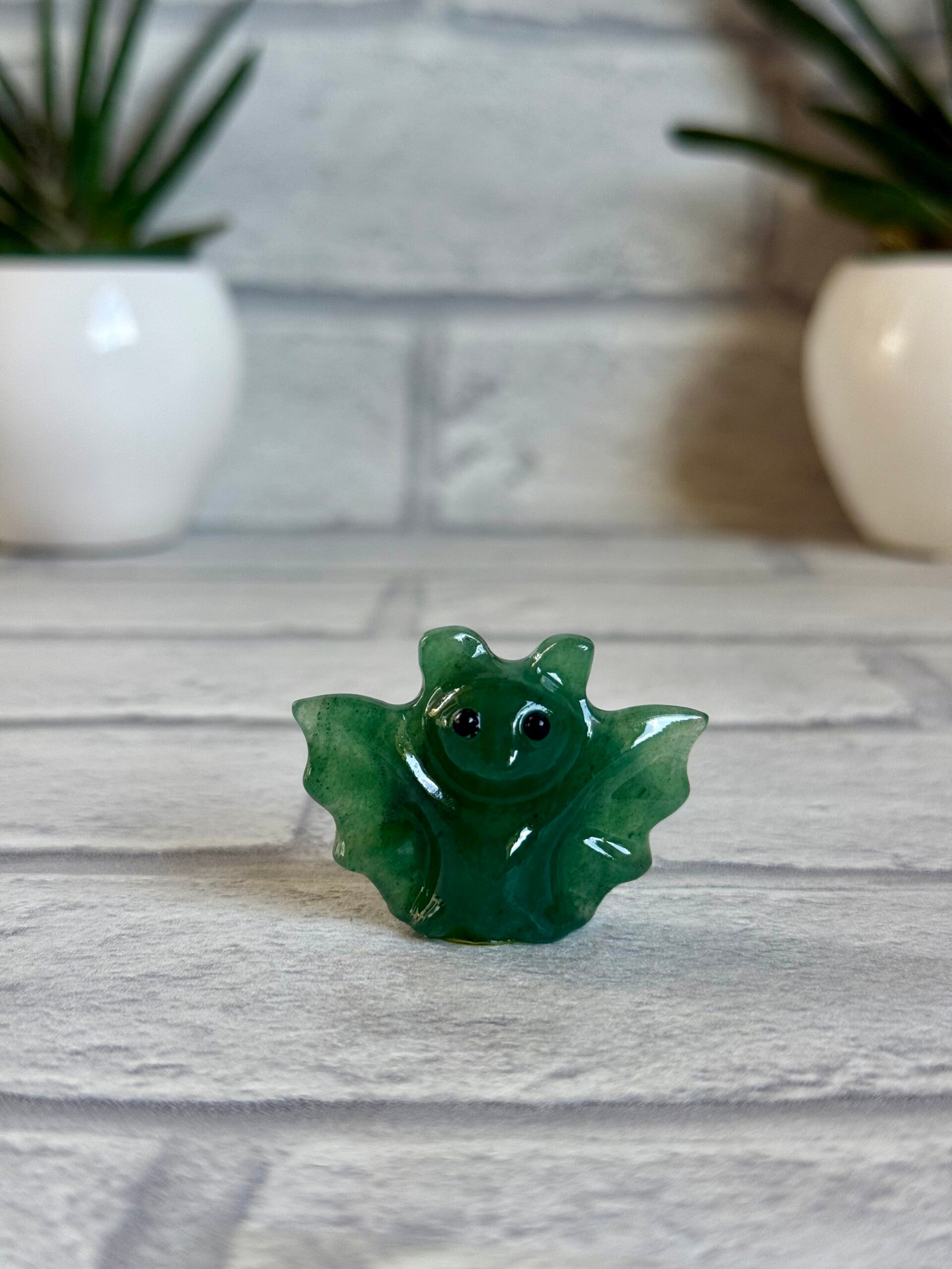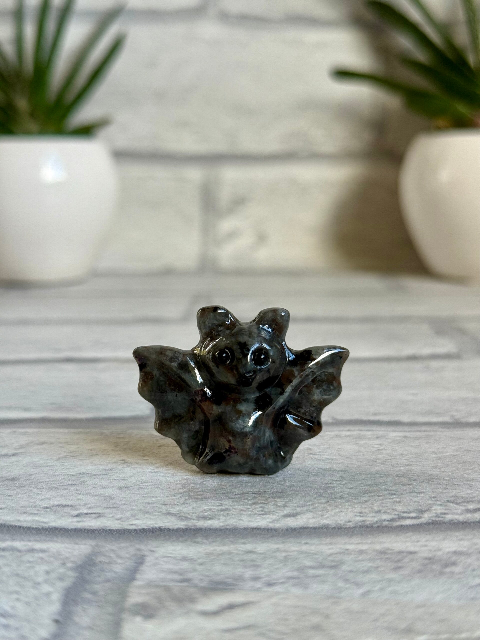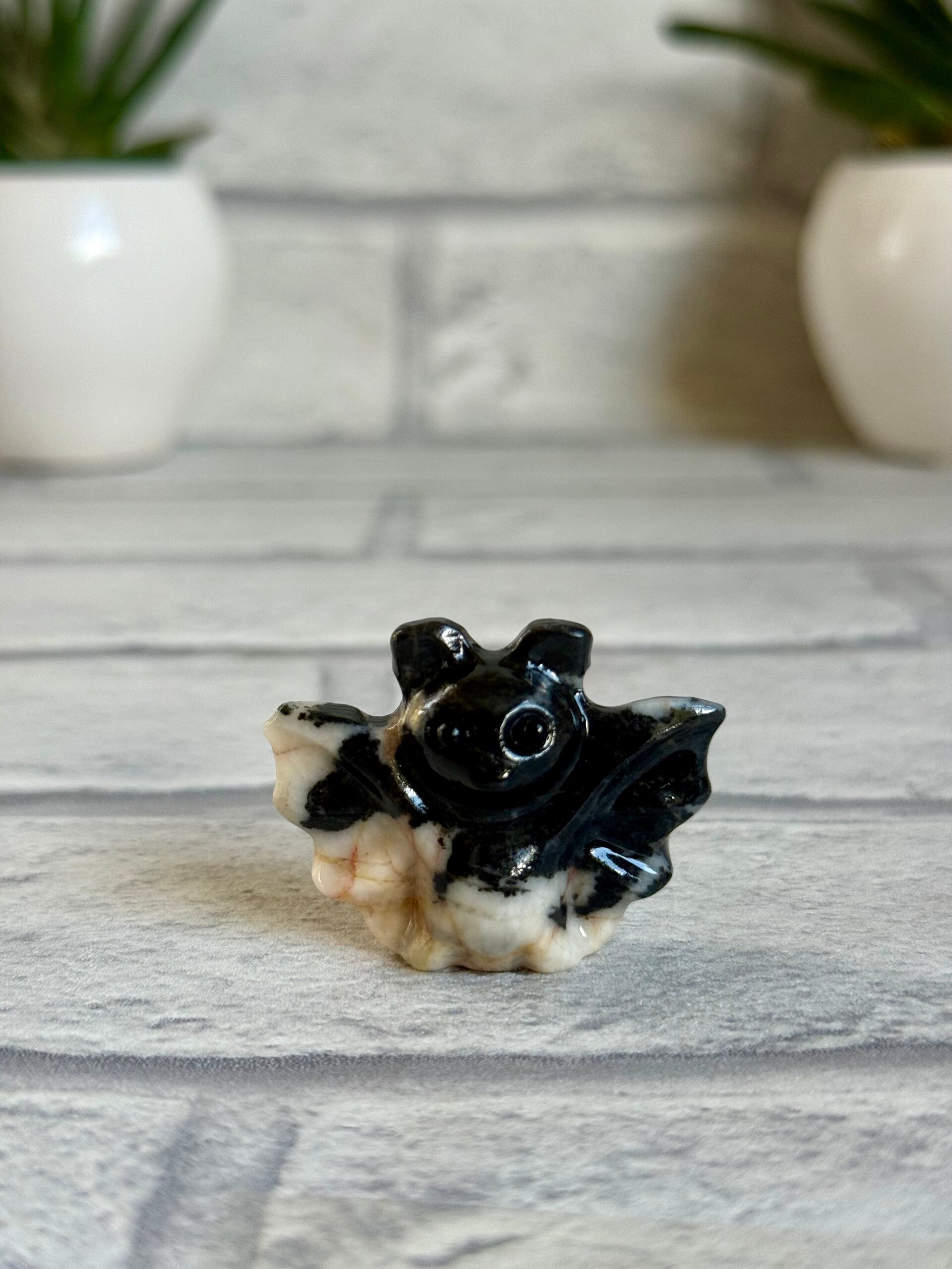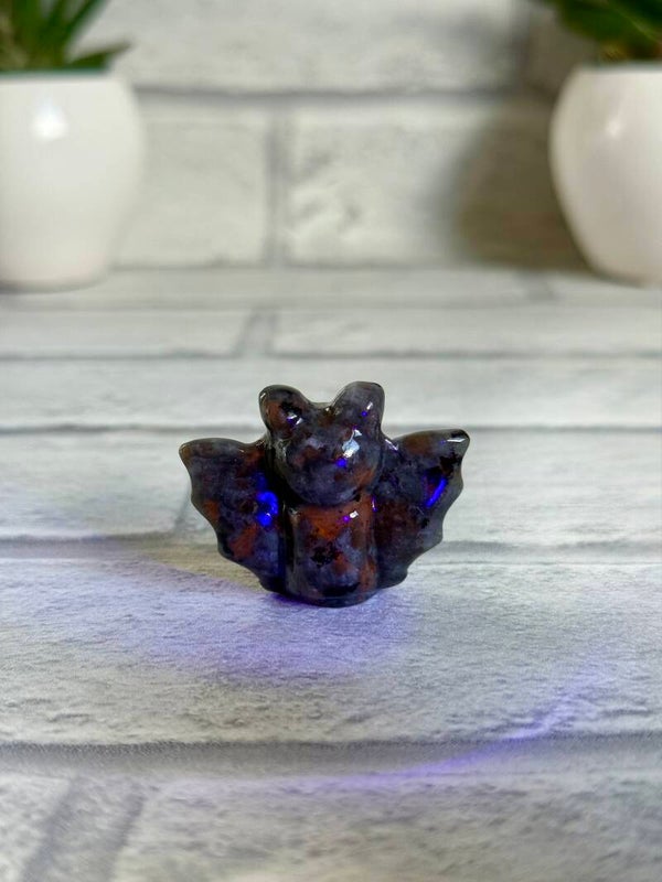 Cute Bat Carvings in Green Tree Jasper, Pink Zebra Jasper, Yooperlite, Black Obsidian, and Green Strawberry Quartz materials ✨