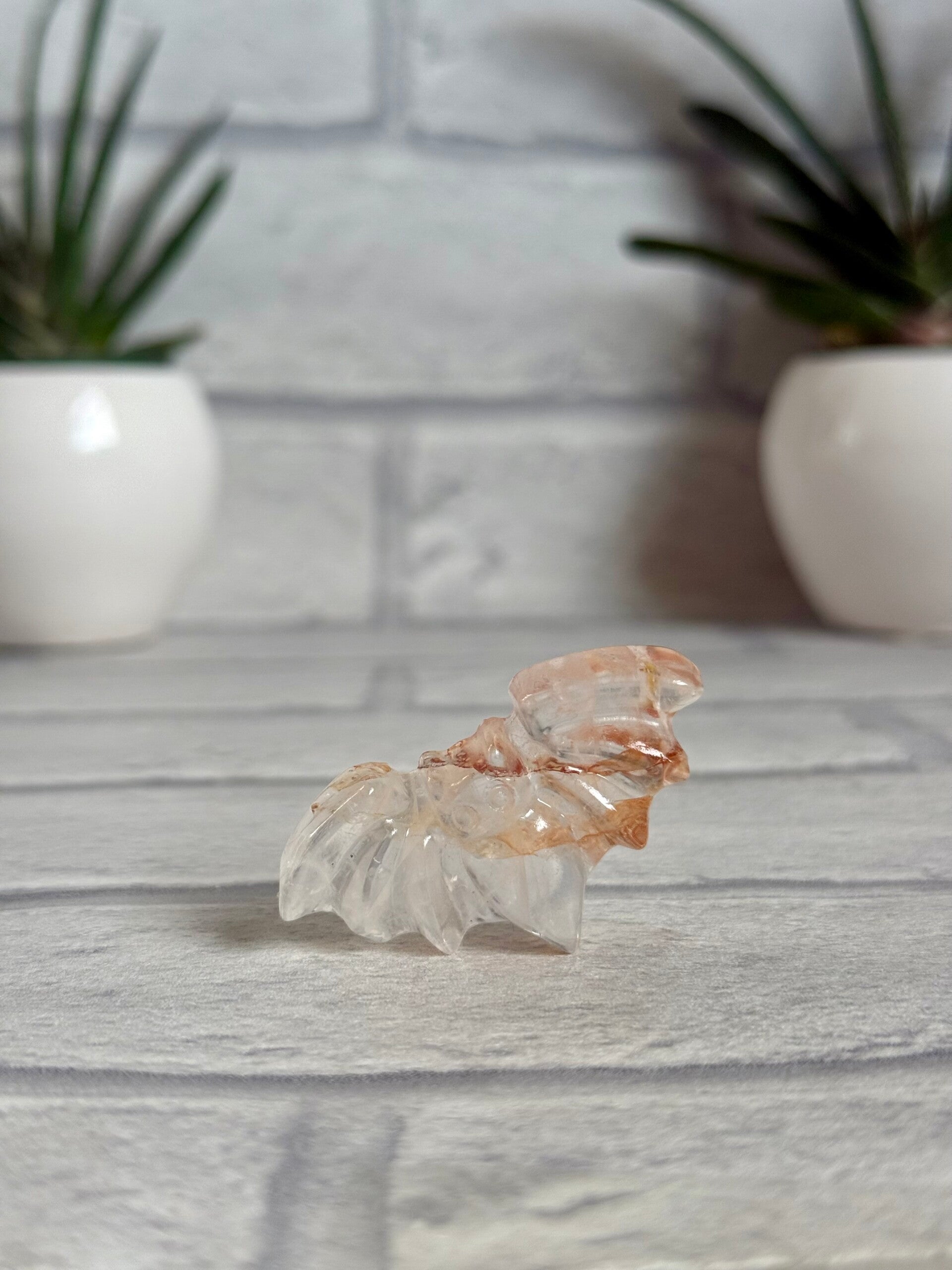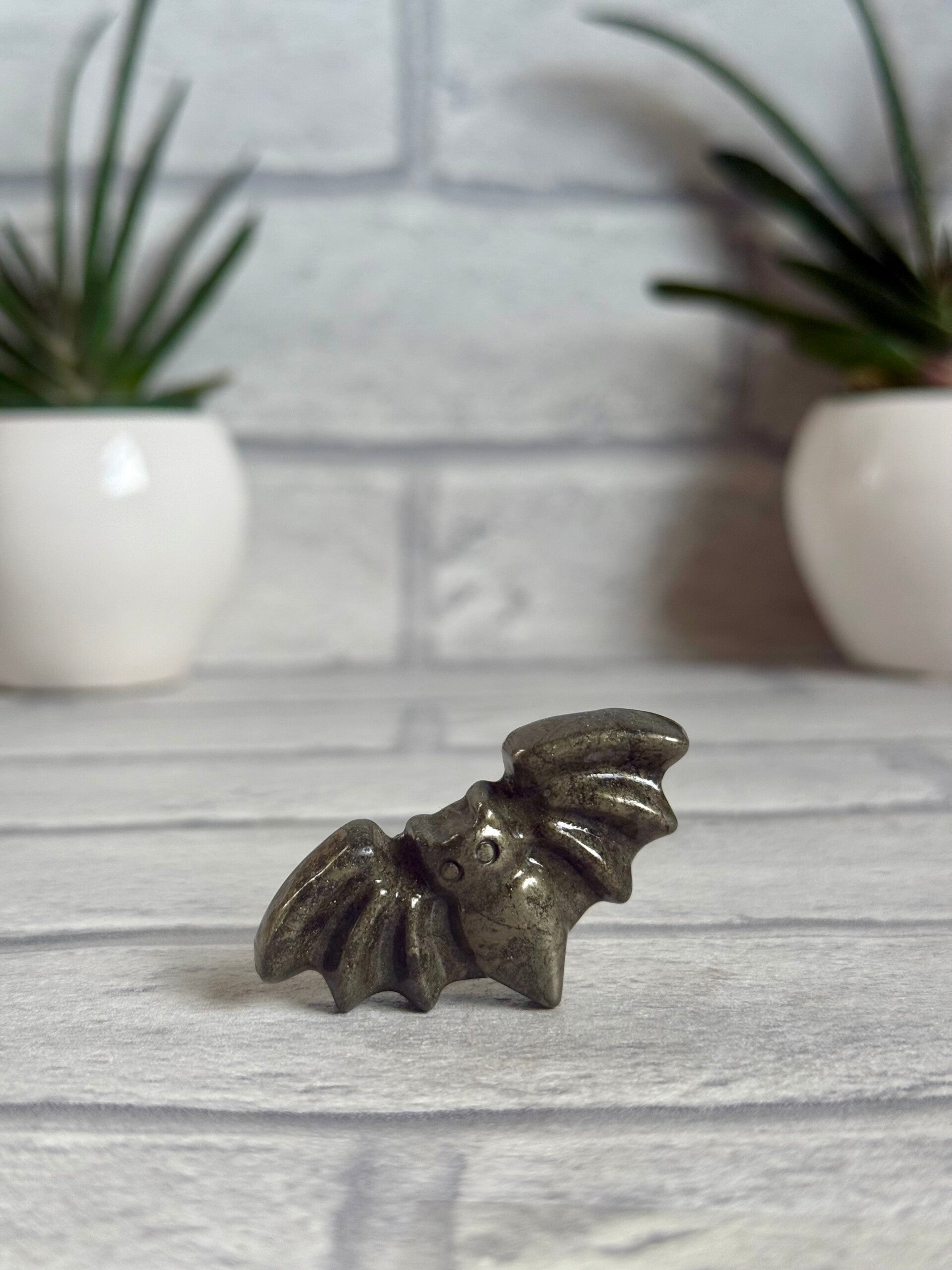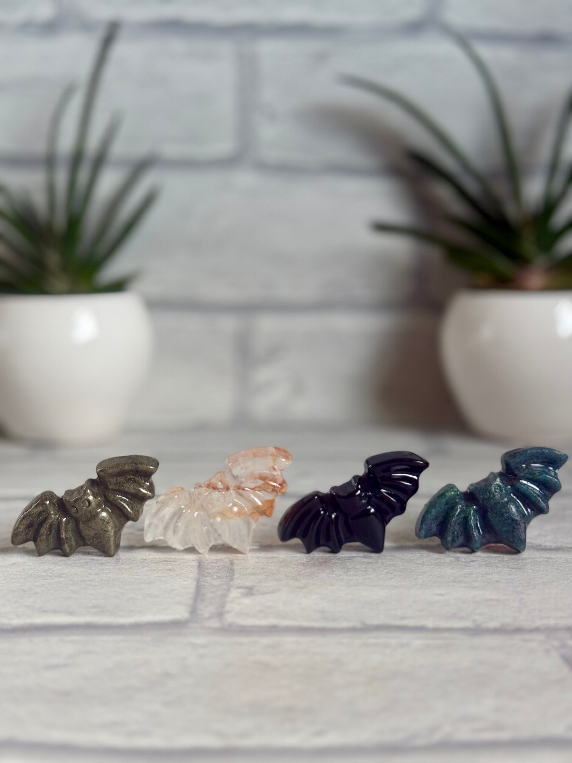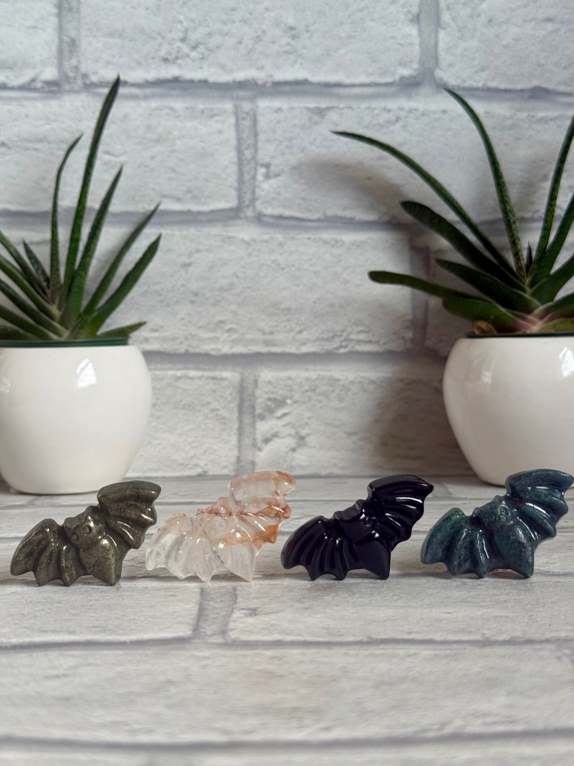 Cute Bat Carvings in Pyrite, Fire Quartz, Black Obsidian and Ruby Kyanite materials ✨