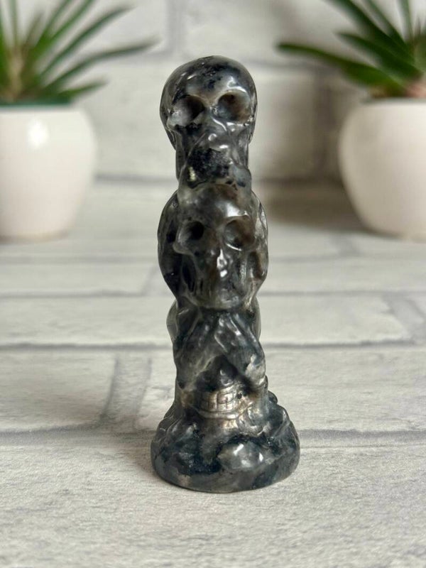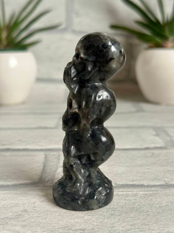 Hear No Evil, See No Evil, Speak No Evil Akull Tower Carvings in Mahogany Obsidian and Larvikite materials ✨