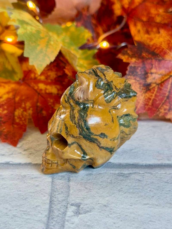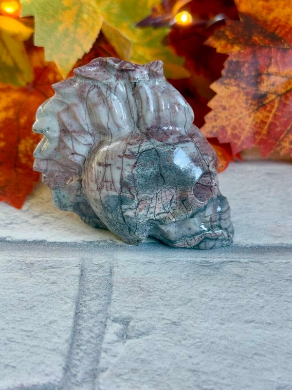 Stunning Large Mohawk Skull Carvings in Pink Picture Jasper, Tigerskin Jasper and Chocolate Zebra Jasper ✨