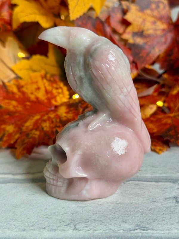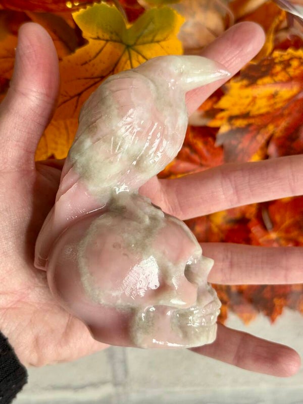 Large Pink Opal Skull And Crow Carving with beautiful natural markings ✨