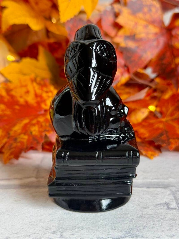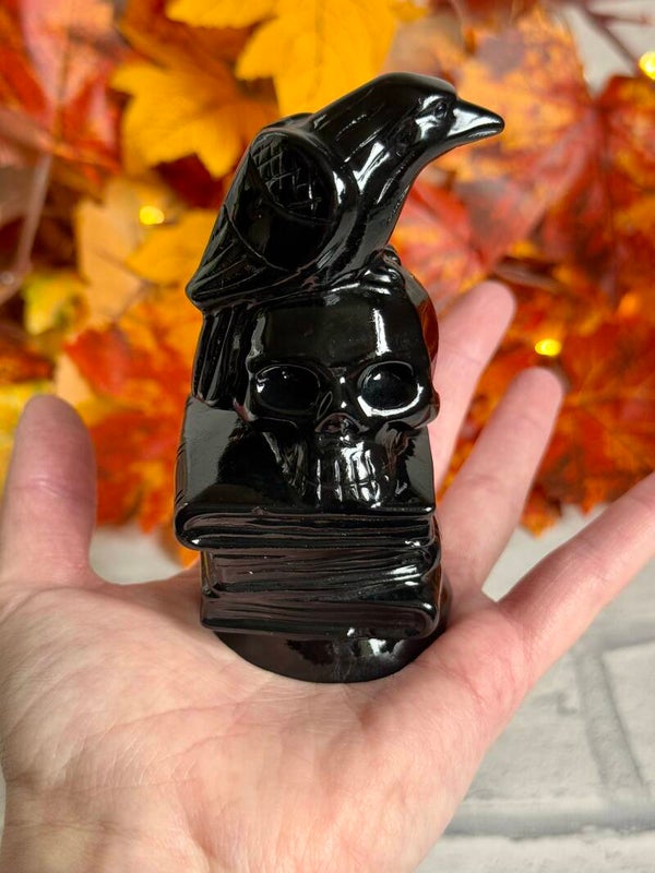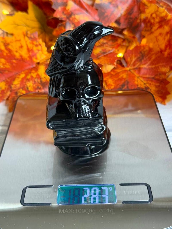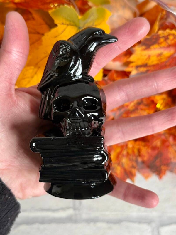 Large Black Obsidian Skull And Raven Carving perched on a stack of books ✨
