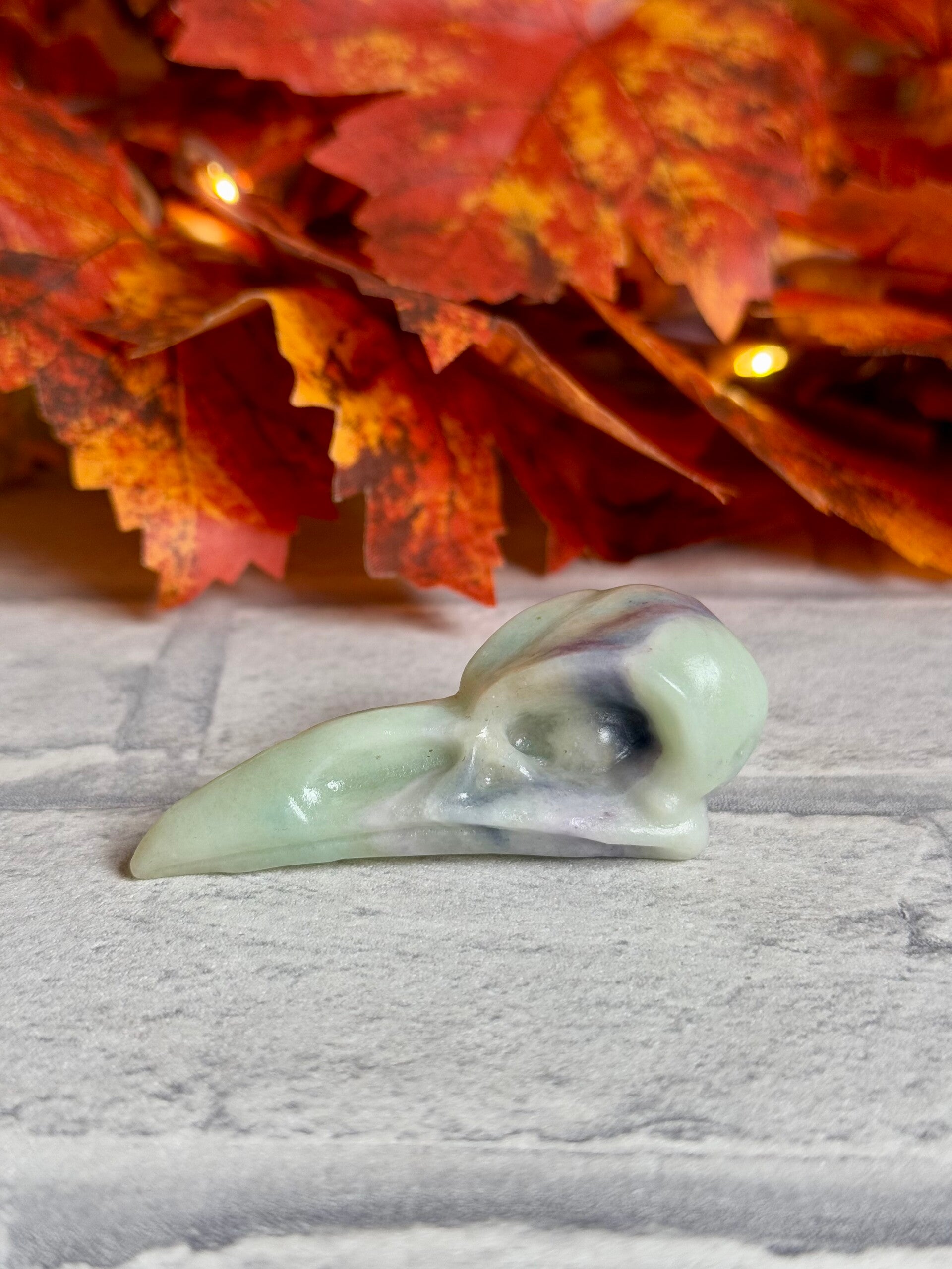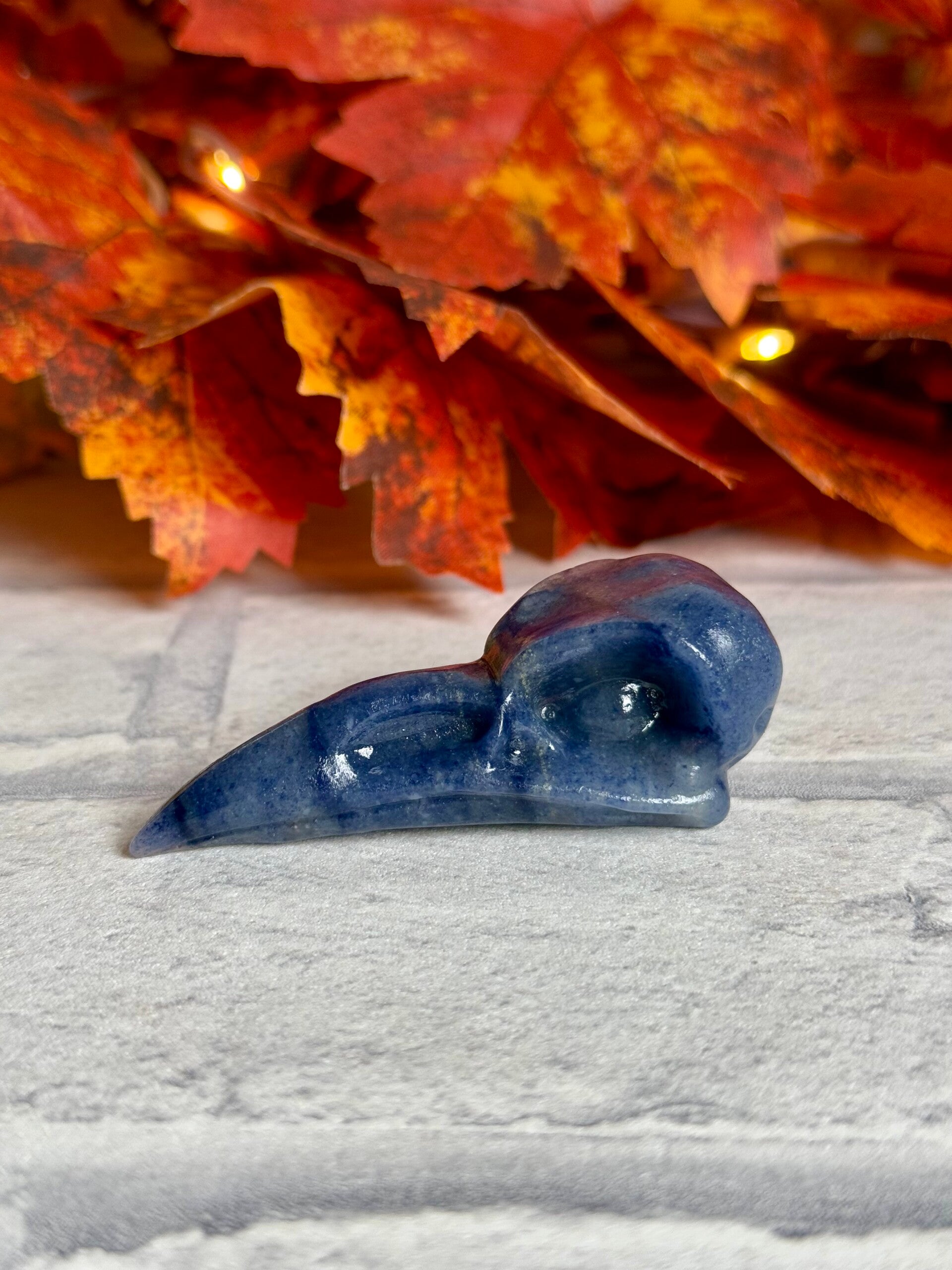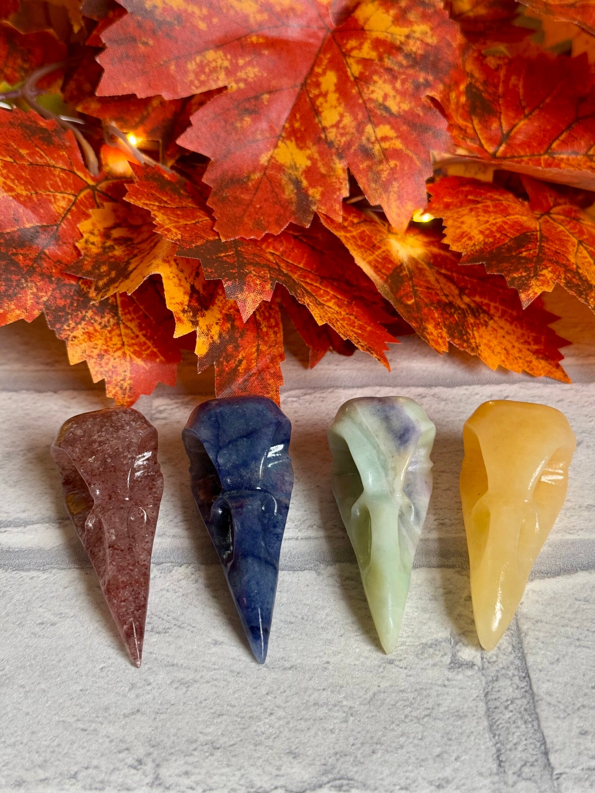 Bird Skull Carvings in Strawberry Quartz, Blue Aventurine, Caribbean Calcite Mix and Orange Calcite materials ✨