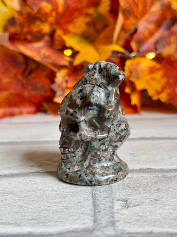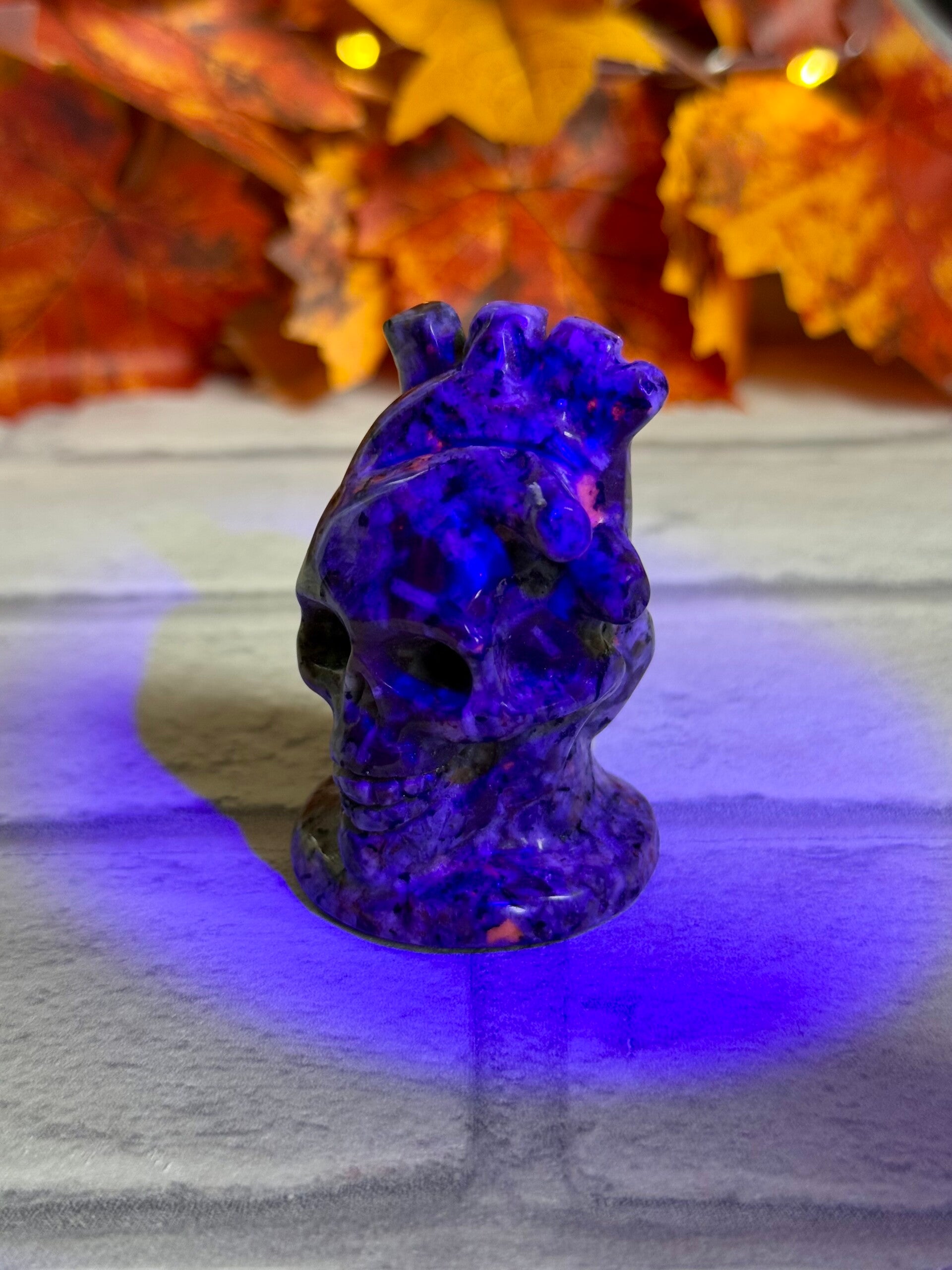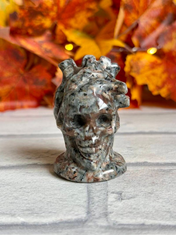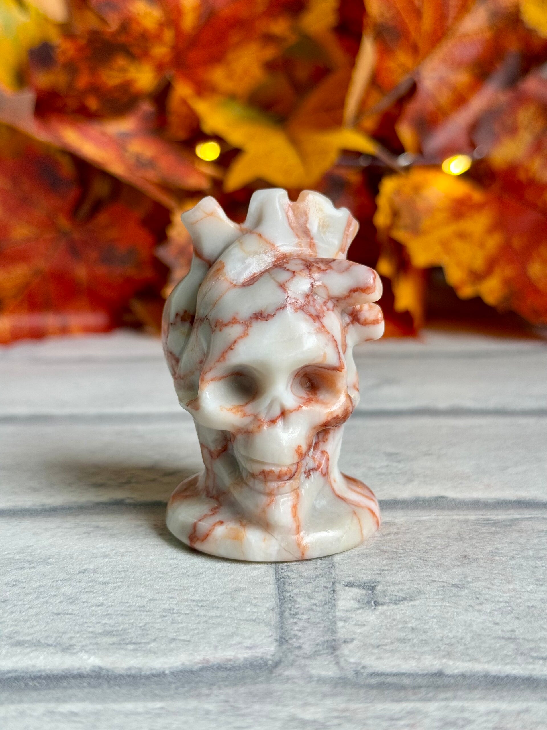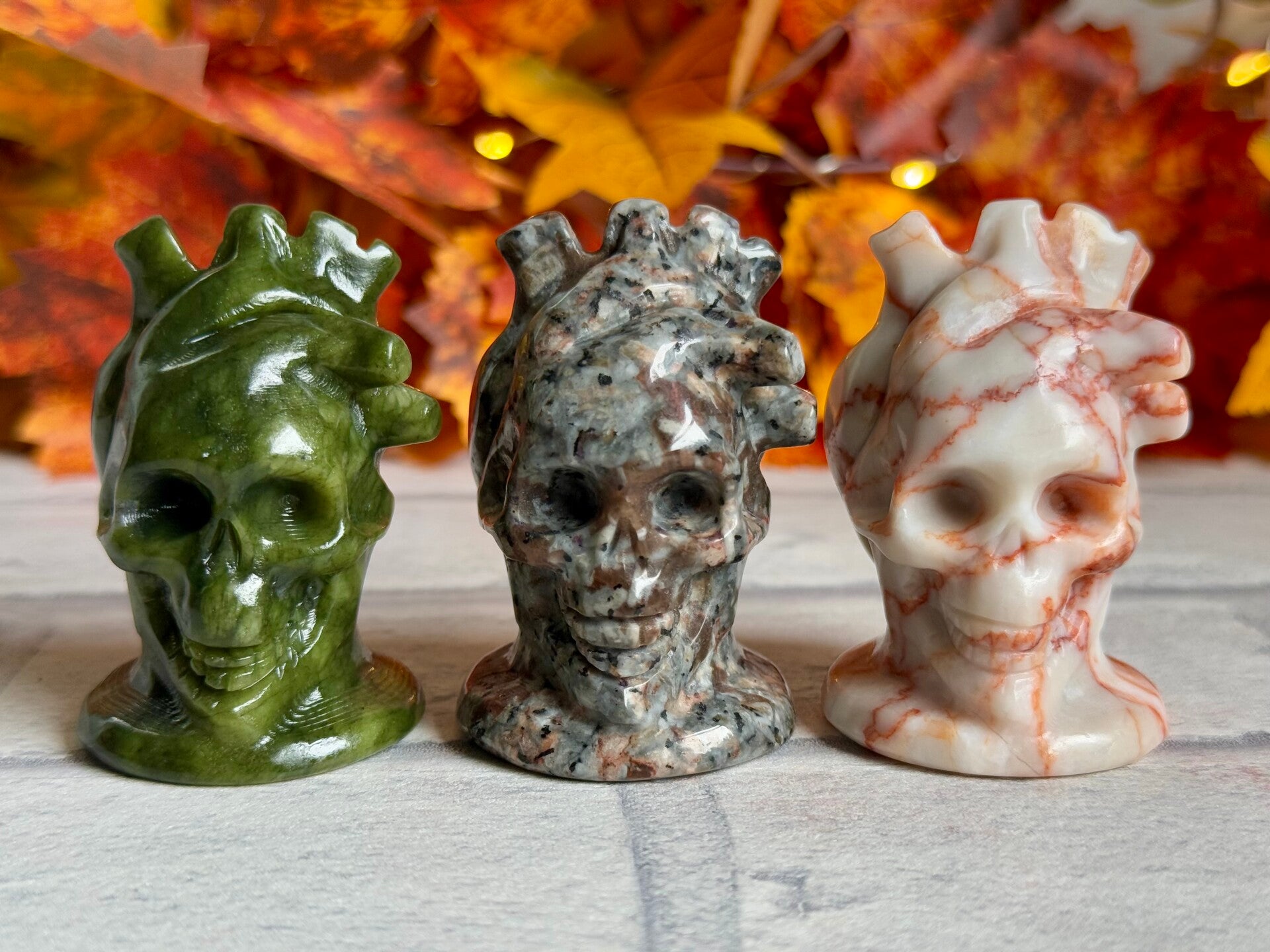 Spooky Human Heart Skull Carvings in Green Jade, Yooperlite and Red Vein Jasper materials ✨